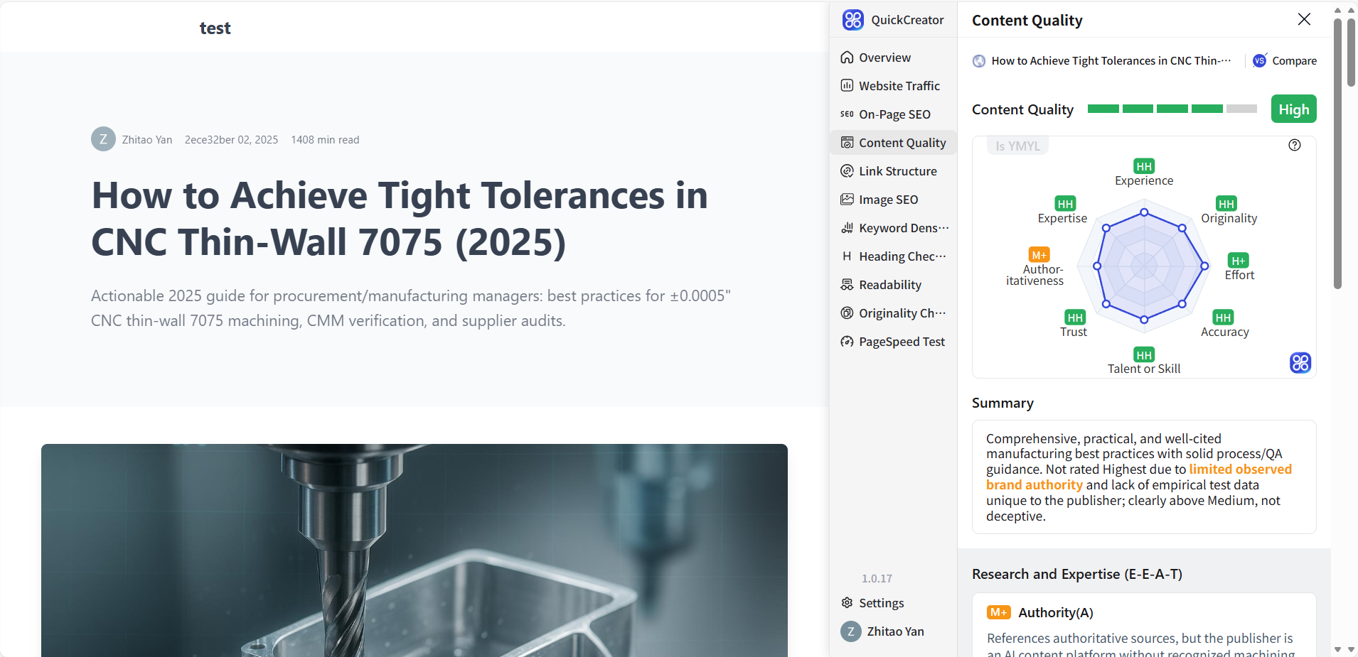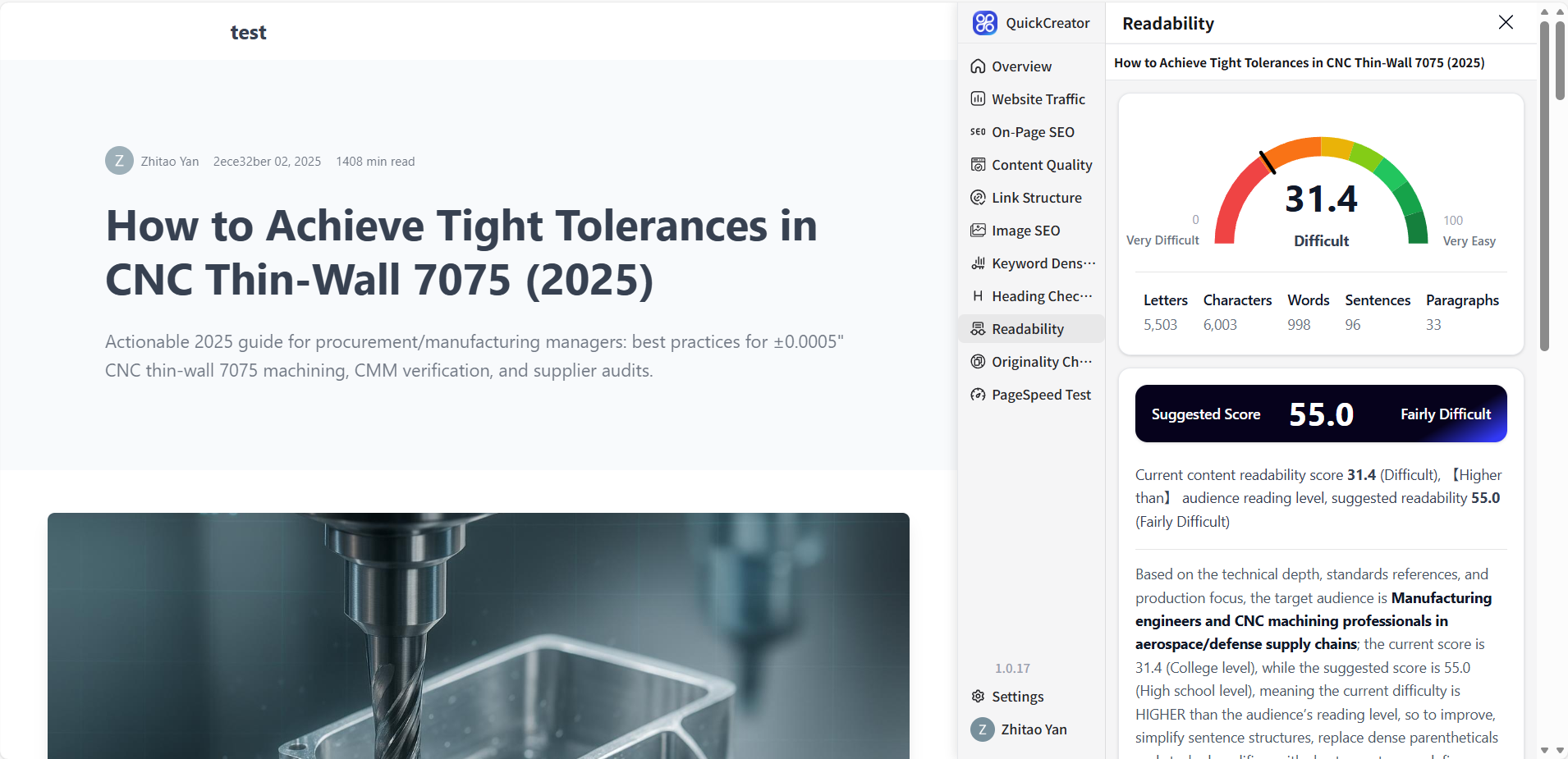 关键词与选题:在QuickCreator输入“CNC thin‑wall 7075 tolerance”,然后选择合适的话题: