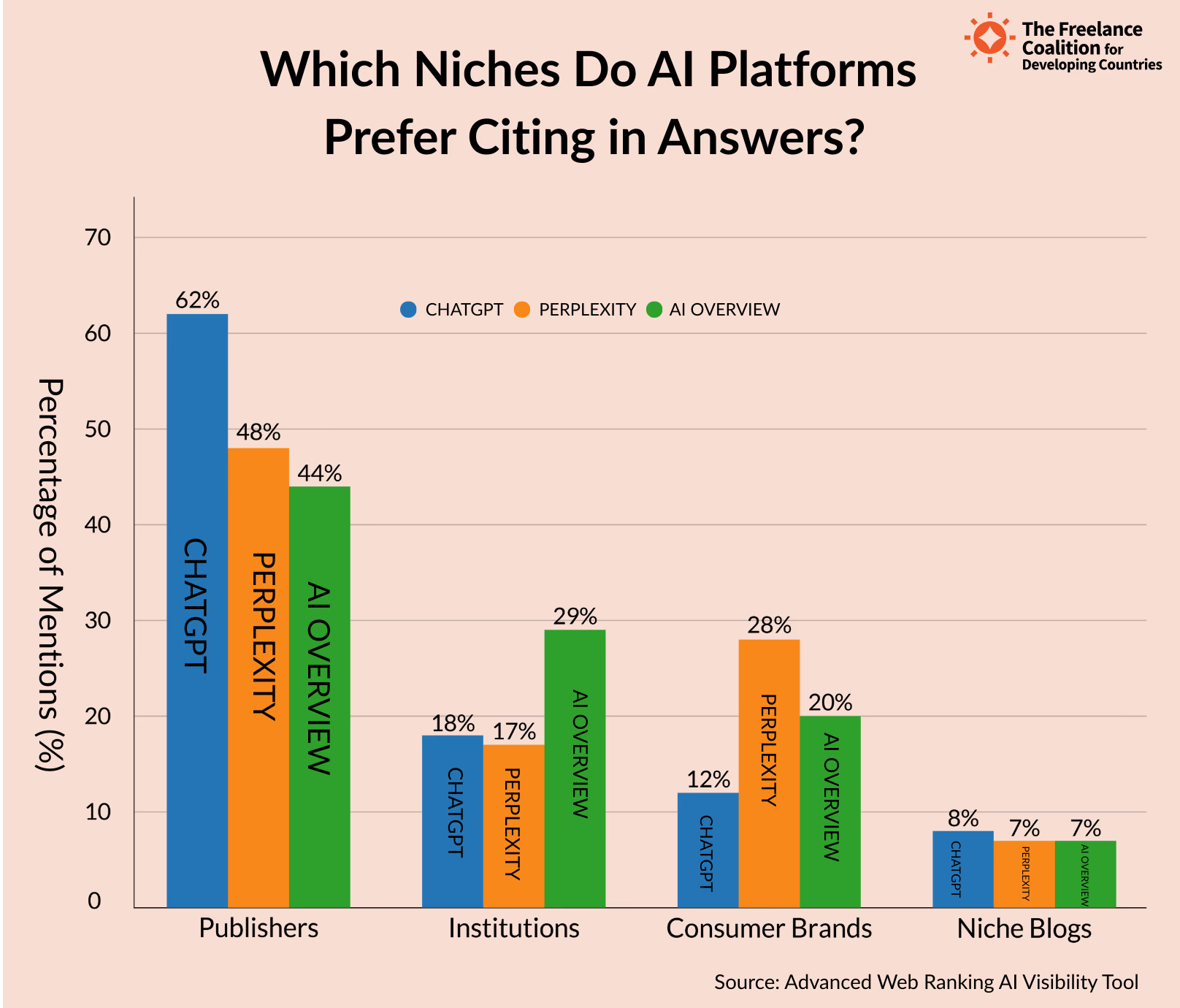 AI 的可见性很大程度上取决于平台的偏见。ChatGPT 奖励成熟的发布者,perplexity尝试新兴产品品牌,而 AI 概览偏向机构。对于品牌来说,在一个系统中可见并不保证在另一个系统中存在。