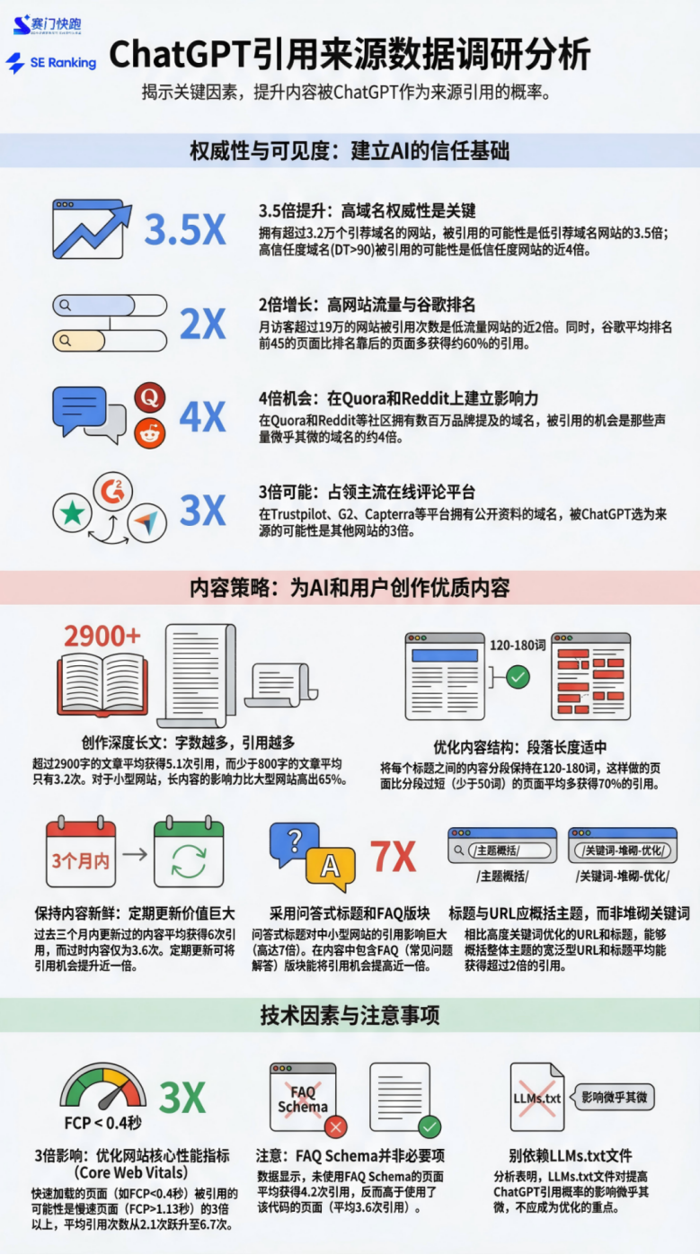 2、多项数据分析显示,外链、域名权重、内容质量、更新频率等因素显著影响页面被ChatGPT引用的概率。
