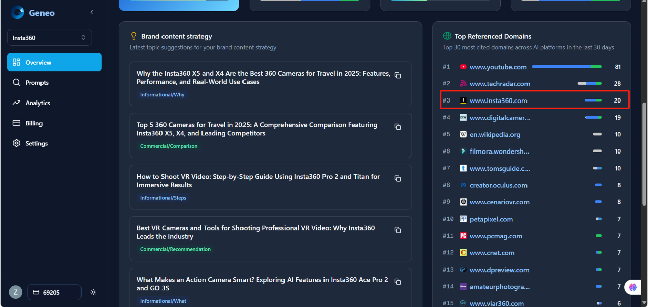 美国在GEO工具方面已涌现出多款产品化的SaaS工具供企业直接使用。一些初创公司推出了监测品牌在AI回答中出现情况的工具,例如 Geneo、Otterly、Profound 等平台,可以定期用模拟提示在ChatGPT、Google SGE、Claude、Gemini等生成式搜索中检索企业内容是否被引用,并报告可见性排名[29]。还可以跟踪品牌或网站何时出现在谷歌AI概要、ChatGPT结果中的引用频率和语境,并与竞争对手进行比较[30]。这些工具相当于GEO版的排名监测,自动运行设定的提示词,帮助企业量化自身内容在AI回答中的曝光。Quickcreator还提供专门用于内容优化的助手,比如根据AI偏好调整措辞、增加可被引用的要点等。从工具角度,形成了“竞争监测-发现问题-高质量内容创作-竞争监测”的闭环。