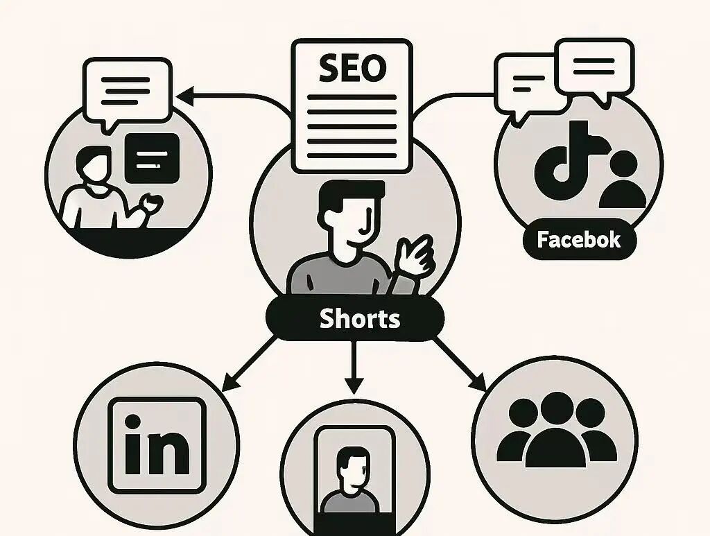 我们可以让一篇SEO长文,成为你整个社交内容矩阵的“母内容”。比如,我一篇2000字的指南型长文章,可以把它拆解为3到5段简短内容, 拆解出来的内容可以拍成60秒的讲解短视频、写成金句帖、痛点帖等。同时在LinkedIn、YouTube Shorts 、TikTok、Facebook群组等渠道发布。社交和SEO的最大协同点就是内容本身可以循环利用。你可以让SEO文章为社交提供素材,也可以让社交热点反向推动SEO流量增长。