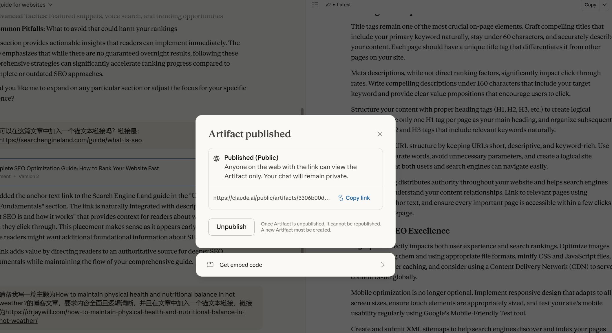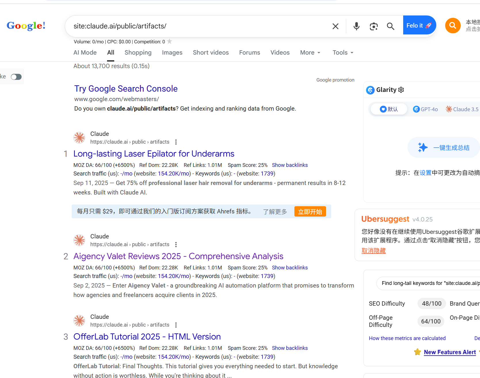 最近看到一个视频号的一个人提到了一个策略,说用claude生成的文章直接发布为artifact链接,可以让你的文章5小时内排名前页。我好奇,我倒是想探究探究。