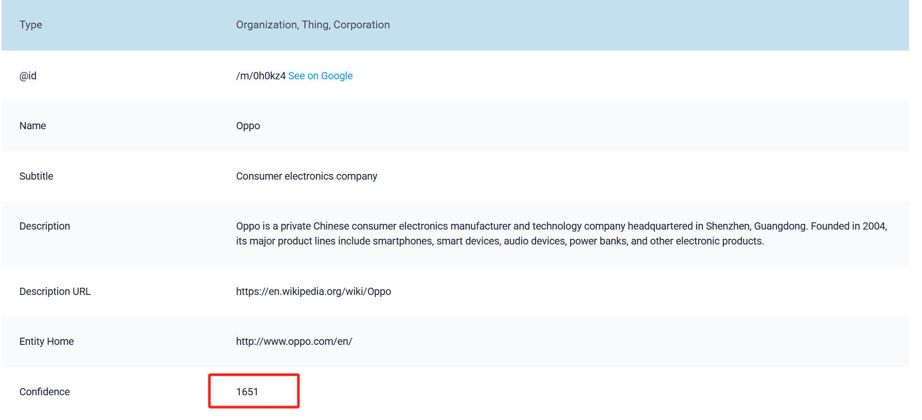 就能看到自己品牌的Entity得分,例如OPPO的 Entity Score 为 1651