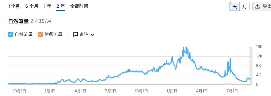 这种流量主要表现在网站在短时间内,因某一篇文章或少数几个页面突然获得大量谷歌自然搜索流量,但这种增长并不稳定、不可持续,且难以转化为真正业务价值。我们可以通过SEMRUSH这样的工具看一下流量曲线,如下图几个典型: