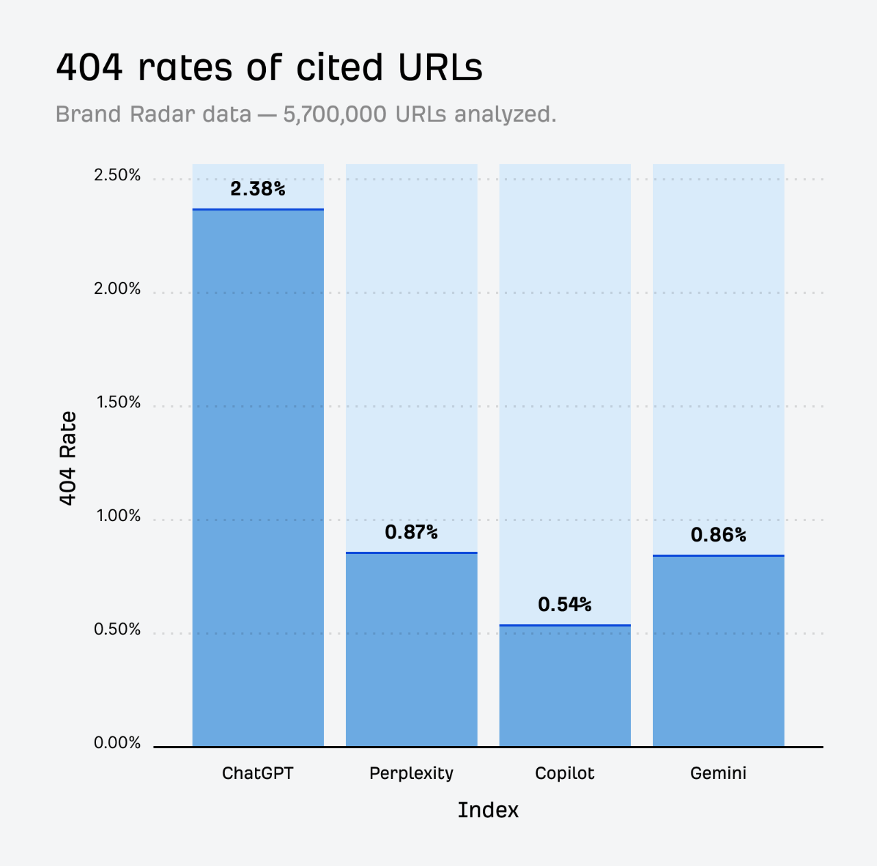 Ahrefs 分别使用 Web Analytics 和 Brand Radar 这 2 个工具,测试 AI 中 404 链接的情况,结果发现 ChatGPT 的 404 比例都是最高的。下面是具体数据。