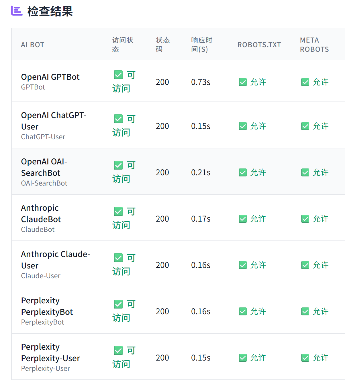 对于中大型网站,通常有多层安全系统,除了常规的 robots.txt 文件外,还有 CDN、服务器防火墙、速率限制系统、地理限制等防护措施。因此,使用本工具来检验 AI bot 是否正常抓取,是非常有必要的。