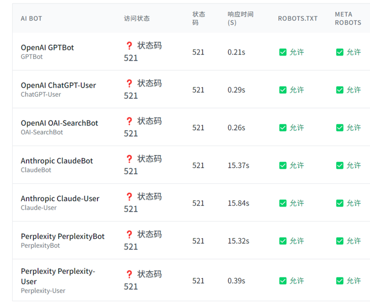 答:现代大型网站通常采用多层安全系统。即使AI爬虫在robots.txt中被明确允许,它们仍可能在其他级别被阻止,如CDN级别阻止、防火墙规则、频率限制系统等。这造成了预期政策与实际访问之间的差距。所以检查AI爬虫访问,可以全方位分析 AI 爬虫抓取是否正常。