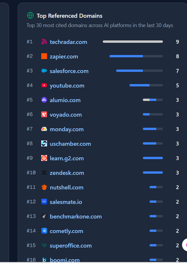 HubSpot算是我们SaaS领域中内容营销做的非常成功的企业,也是QuickCreator学习的榜样。我们看看CRM相关的prompt,AI回答都引用了哪些域名: