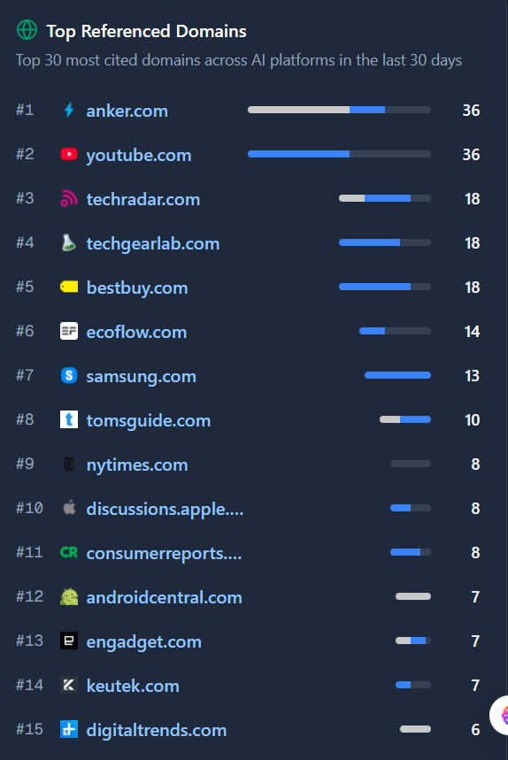 由于安克的SEO做的很出色,所以自己官网的内容被引用最多。接下来是YouTube和TechRadar的内容。Reddit没有出现在前15名。