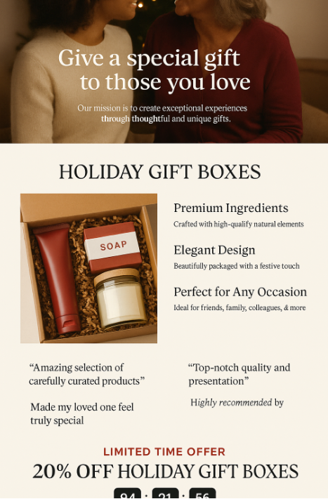 随后详细介绍节日礼盒的特色组合,包括成分亮点、设计理念、适用场景; -