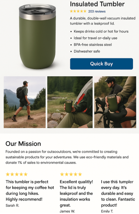 品牌愿景区块,讲述品牌创立初衷与环保承诺,激发用户认同; -