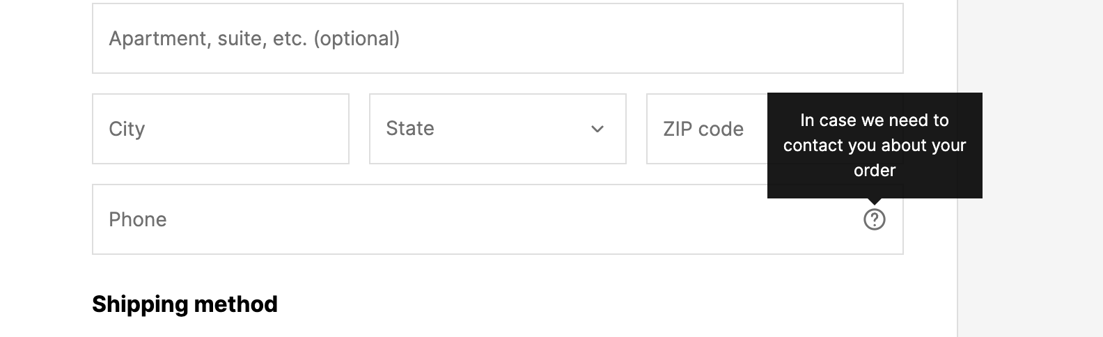 电话号码字段下方:「仅用于物流更新」——提升信息填写率
