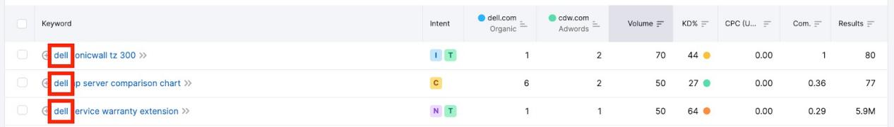 筛选品牌关键词,特别是查看竞争对手是否在付费广告中使用了这些关键词。这是一种常见的PPC(按单次点击付费广告)策略,在投放广告时提到竞争对手的品牌名称,以获取他们的部分流量(例如,你可以看到hp.com出现在Google付费广告排名首页,而lenovo.com则是在自然搜索排名首页)。