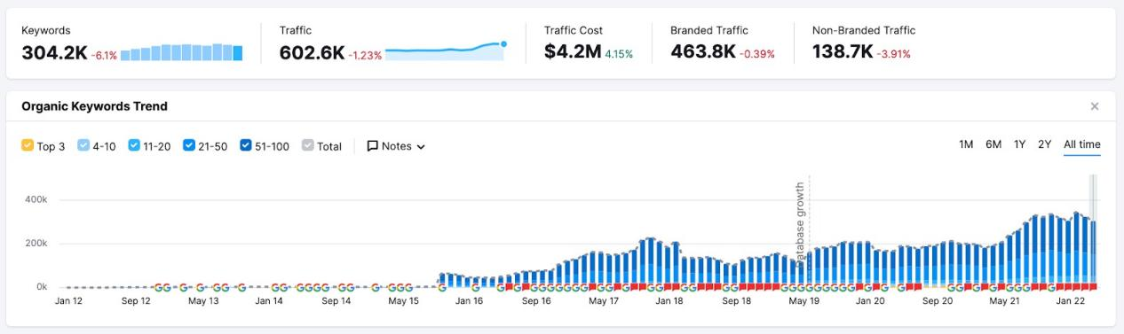 通过Semrush的Organic Research工具,你可以查看自2012年1月以来的所有历史数据,并且所有谷歌算法更新都会在图表中标记出来。