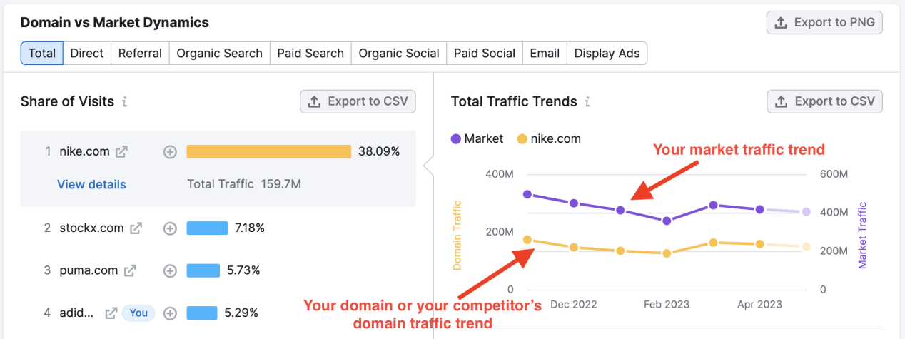 网站的流量会因多种因素而波动。首先,你需要确定最近流失的流量类型(自然搜索流量、付费搜索流量、推荐流量等),然后将该渠道的表现与竞品和整个市场的流量进行比较。借助Market Explorer工具,你可以查看市场整体流量趋势并与自己的网站进行对比。