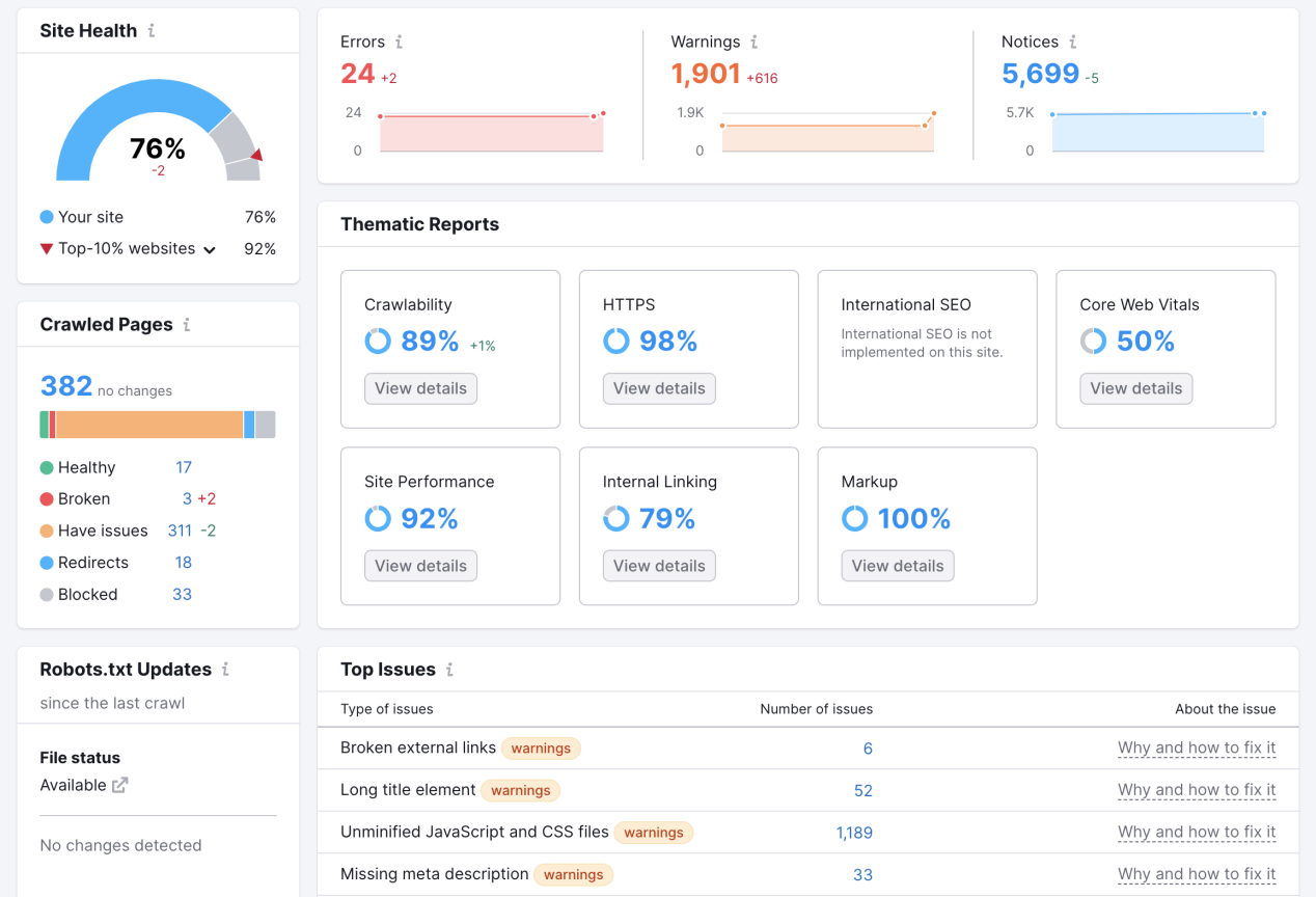 有时网站的技术错误也可能导致流量下降。使用Site Audit工具,可以发现影响排名的关键错误,例如内链问题、Hreflang标签混乱或页面加载速度低等。