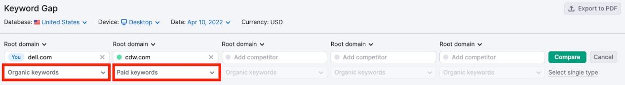 如果你的流量下滑,可以使用 Keyword Gap Tool,将你的自然搜索关键词与竞争对手的付费关键词进行对比,查看是否有共同的关键词出现。