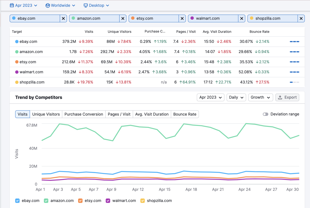 查看所有竞品的历史流量统计,如果他们的流量持续增长(绿色数字表示正向增长),而你却在下滑(红色数字),这将帮助你了解流量流失的原因,以及谁在争夺你的流量。在Trends by Competitor图表中,您可以按天、周或月查看数据,精确找出流量下降的时间段。