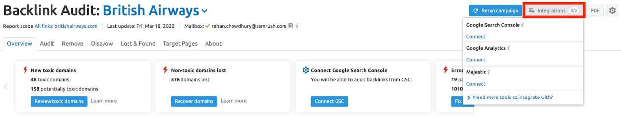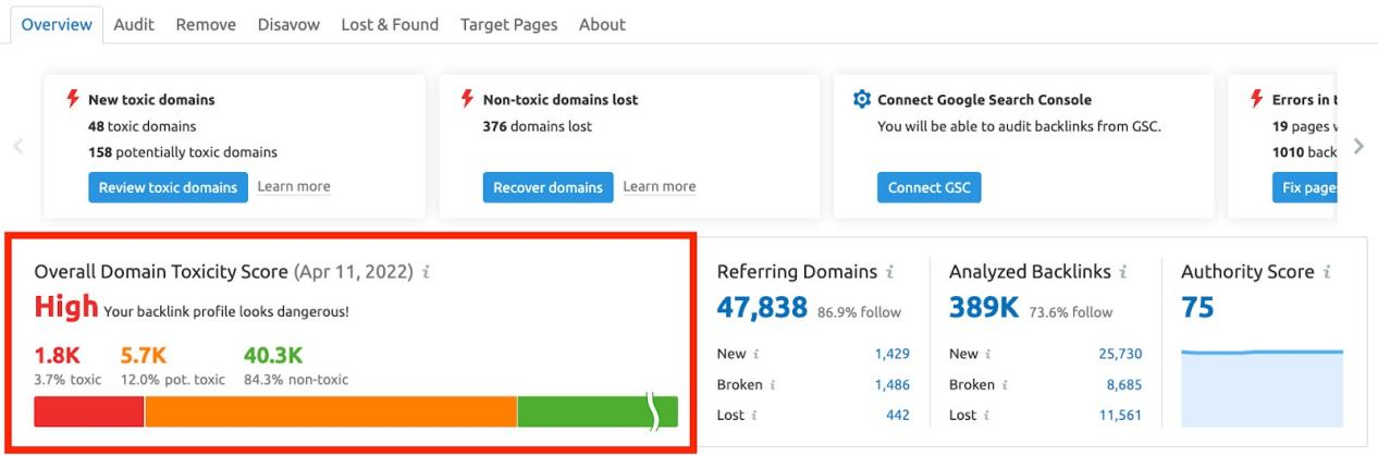 在Backlink Audit工具中分析你的外链健康度,从Google Analytics和Google Search Console提取数据,与 Semrush的数据整合在一起。