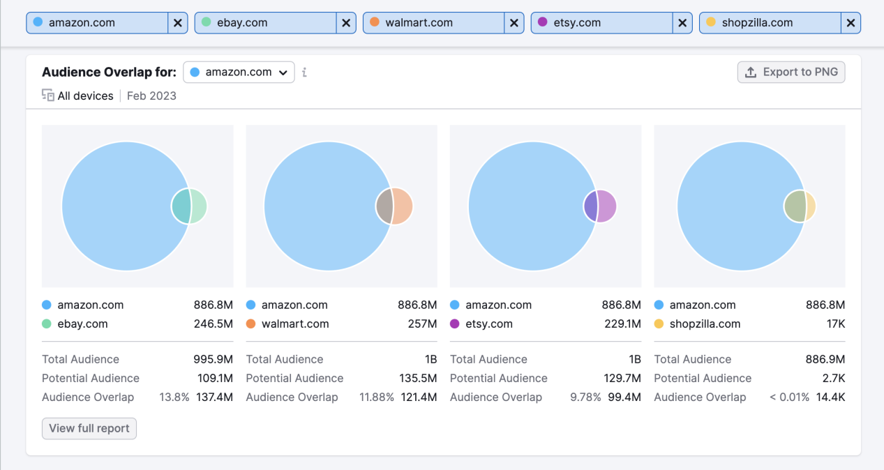 另一种查看方法是比较Audience Overlap(受众重叠度):如果你现在与竞争对手重叠的受众比以前更多了(而独立访客数有所下降),这意味着他们可能已抢走了你的部分受众——接下来的任务就是找出他们是如何做到的。