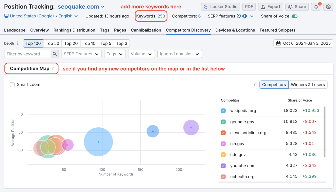 为了发现这样的竞争对手,利用Position Tracking工具,通过设定一组目标关键词来监测你网站在特定地区的曝光情况,并打开Competitors Discovery地图,找到该地区与你最接近的竞争对手。