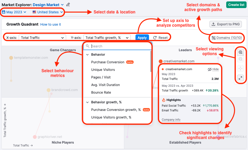 在Market Explorer中输入你的域名,并选择地区,该工具会根据你的域名识别所属行业,并构建一个由类似域名组成的“市场”。你将看到你所在地区的市场竞争者列表,并可以将任何网站的流量与市场数据进行对比。
