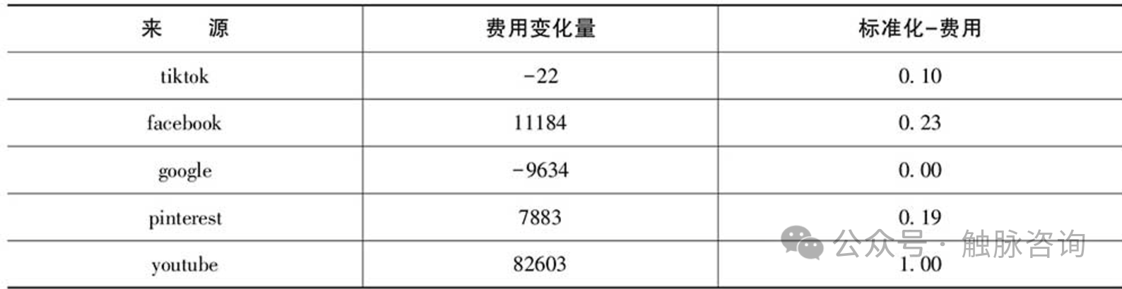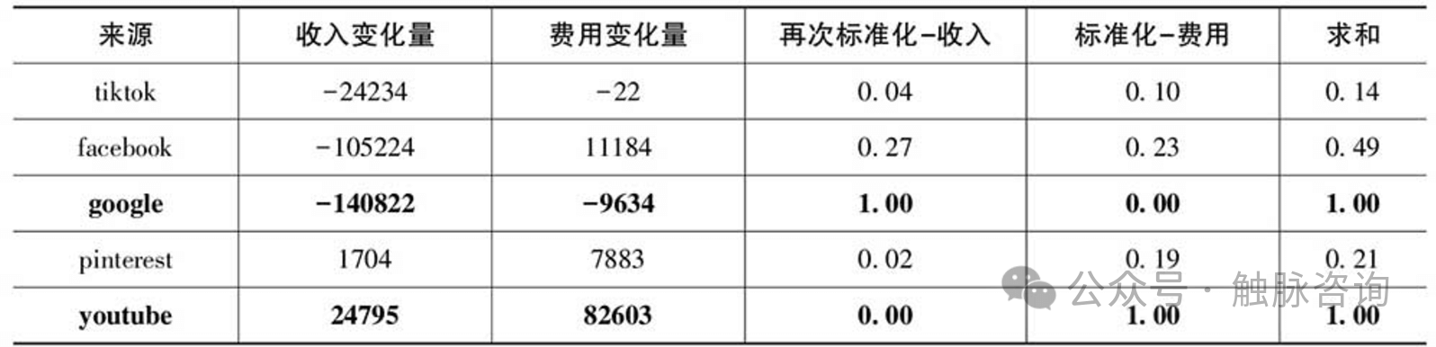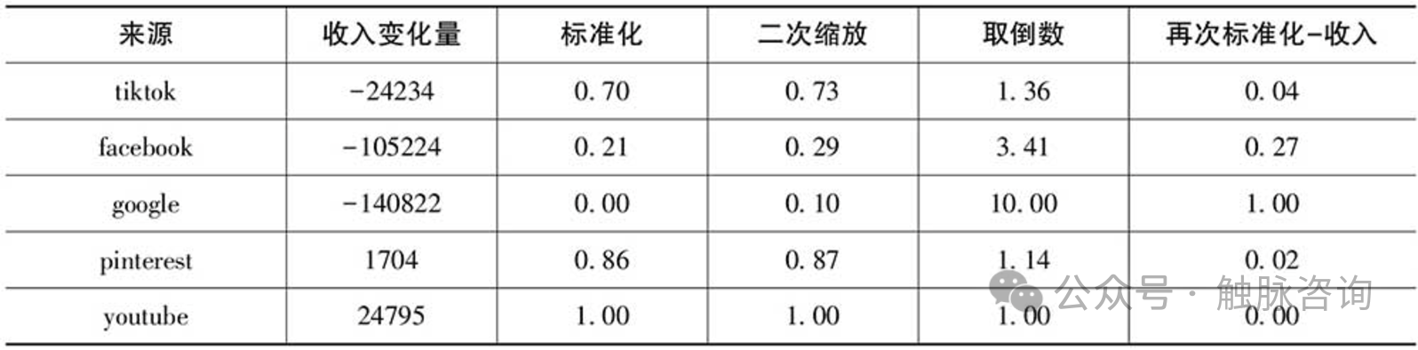 第一,基于昨日收入-前日收入计算每个渠道的收入变化量,然后使用Max-Min标准化求出标准化后的结果。