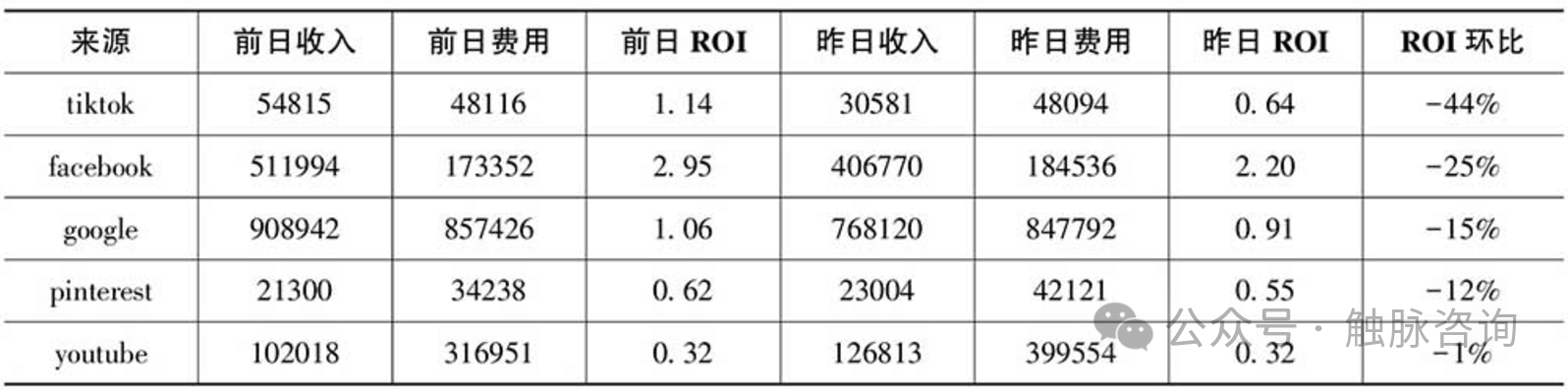 与流量下滑的排查不同,ROI下降的排查无法单纯依赖细分分析,而是需要综合考虑成本和收益这两个因素,全面评估每个渠道在这些方面的变化对整体ROI的贡献。