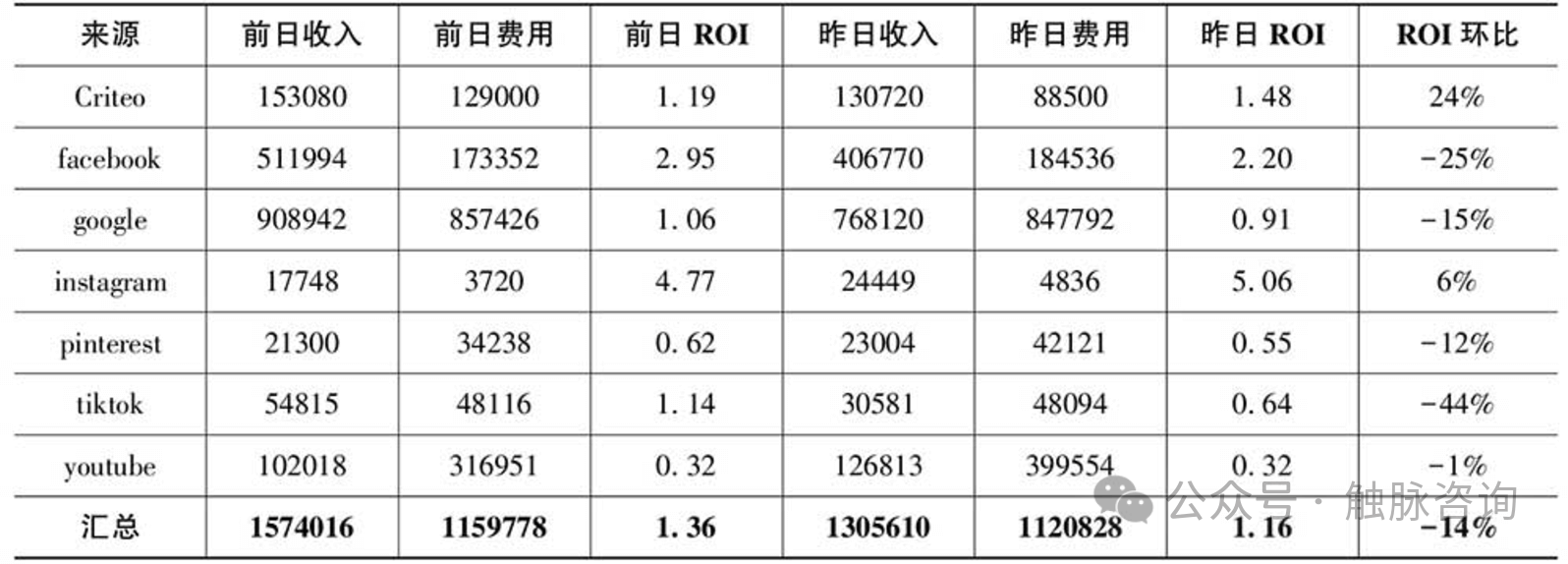 数据显示昨日ROI(1.16)比前日ROI(1.36)降低了14%,由于ROI是比例值,因此无法直接通过各渠道的ROI环比得出结论。例如表中的tiktok虽然环比下降44%,但由于收入和费用值较低,因此不是构成全站ROI下降的主要因素。