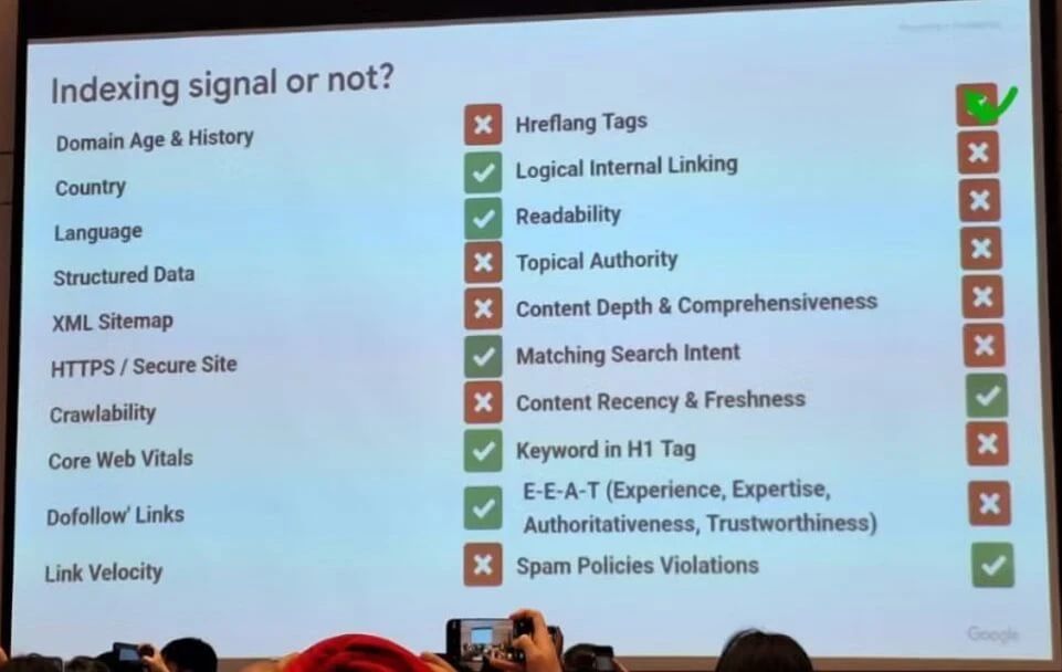 Google 所说的“索引信号”包括:国家、语言、HTTPS 安全协议、Core Web Vitals、Dofollow 外链、Hreflang 标签、内容时效性、是否违反垃圾政策等。