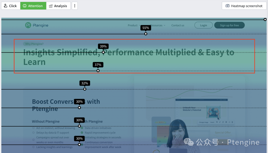 - 观察热图:首先在高流量页面上使用热图工具,以可视化手段展示用户单击、滚动和花费时间的位置。这些数据可以帮助识别什么吸引了用户的注意力,什么信息被略过,什么会劝退用户。