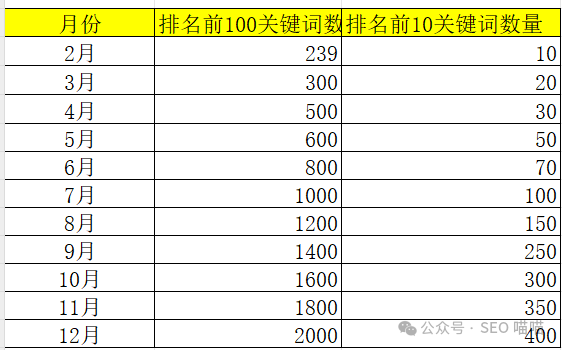 按照每个月分解,每个月的关键词排名数量粗算如下表: