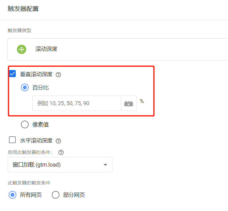 接下来我们需要设置滚动深度的这个触发器,选择垂直滚动深度,一般的网页都是垂直滚动。垂直滚动滚动深度这里选择“百分比”,这里的意思就是把页面按照百分比切割。我们可以把它设置成25%,50%,75%,100%。设定百分比的时候你还要看一下你的网站内容,每一个百分比下的内容是什么要清楚。