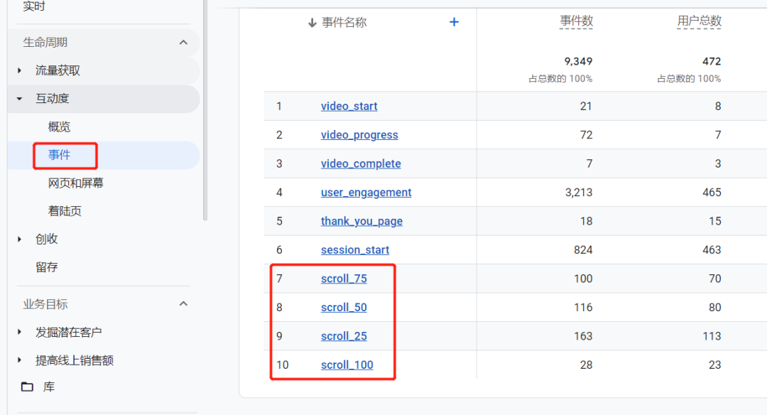同步之后,在GA4后台中,找到事件报告,我们就可以看到设置好的滚动深度追踪。这里它会动态的记录已经预设好的每一个页面深度百分比。