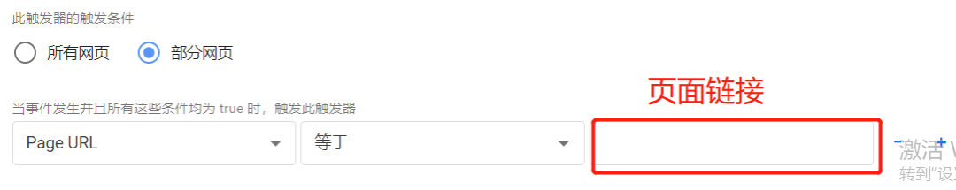 接下来去设置触发条件,我们这里选择部分网页,测试其中的一个页面,一般为广告的落地页。根据以下截图中把需要测试页面链接放到复制粘贴到后面就可以了。
