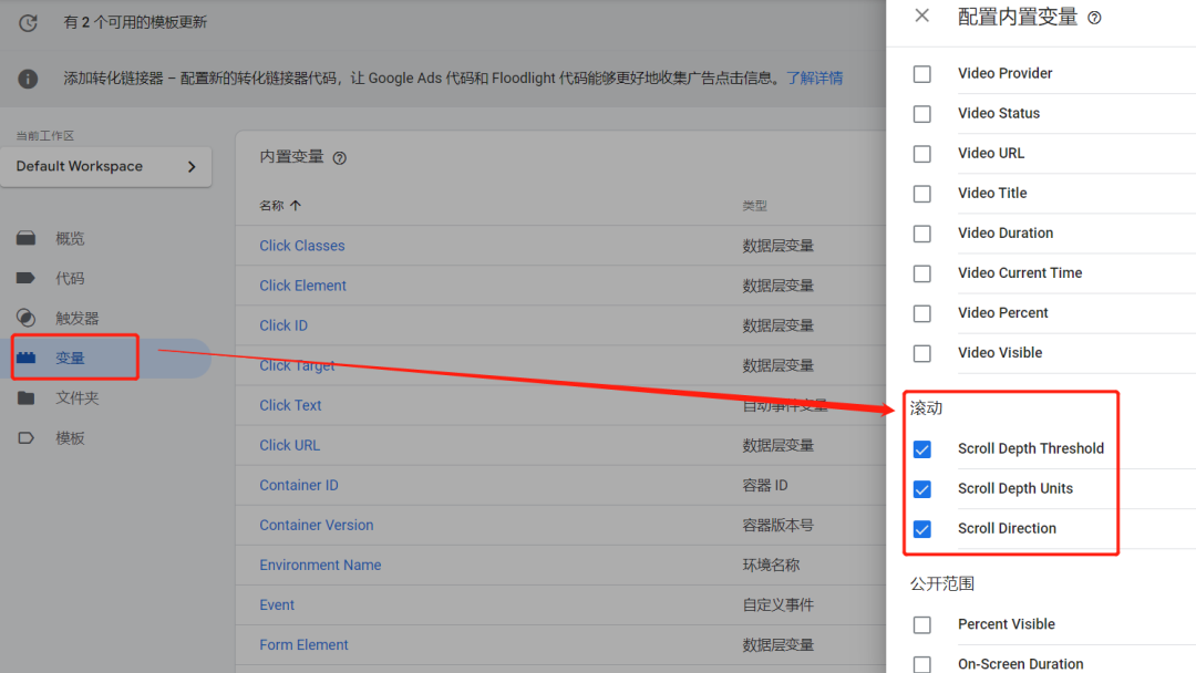 在GTM后台,左侧边栏找到变量,在滚动选项里面把所有项目全部勾选。