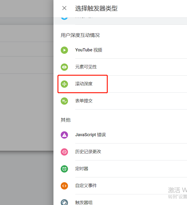 接下来在左侧边栏的找到触发器,触发器类型选择滚动深度。