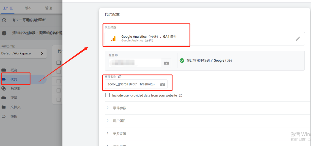 设置完触发条件之后,我们需要设置一个GA4的追踪代码。代码类型选择GA4,下面ID在之前文章有讲到过在哪里找。重点说一下下面的事件名称,这里的事件名称填写“sceoll_{{Scroll Depth Threshold}}”这样一段代码,因为这样可以实现动态的追踪,在下面我会演示到什么是动态追踪。