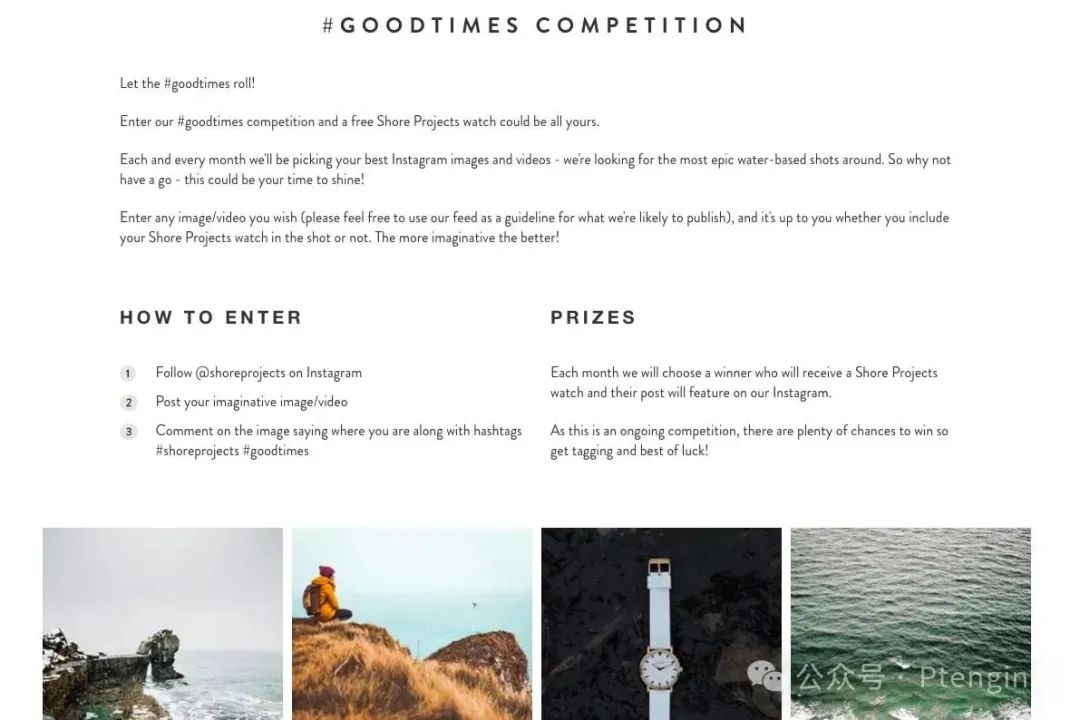 创建一个竞赛:通过提供奖品,如折扣或免费产品,为客户创建内容的动机,以奖励客户创建的最佳照片或视频。例如,手表品牌Shore Projects每月奖励在Instagram上发布他们产品的最佳照片和视频的客户一块免费的手表。