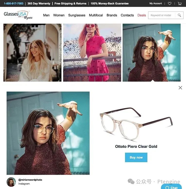 例如,GlassesUSA在其社交购物页面上展示了满意客户戴着GlassesUSA眼镜的照片,该页面由展示满意客户的照片组成的可购物信息流组成。