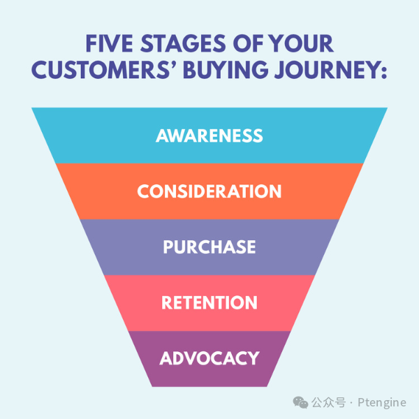 买家旅程主要包含每个客户经历的五个阶段:意识、考虑、决策、复购以及用户忠诚度。在创建内容时,需要考虑访问者当前所处的买家旅程阶段。