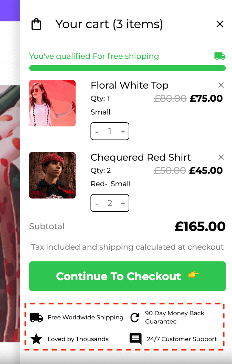无论是传统的购物车页面,还是下拉页面/滑块页面,都可以用图标和文字来增加可信度,使我们的品牌更值得信赖——展示产品的相关政策和客户满意度。