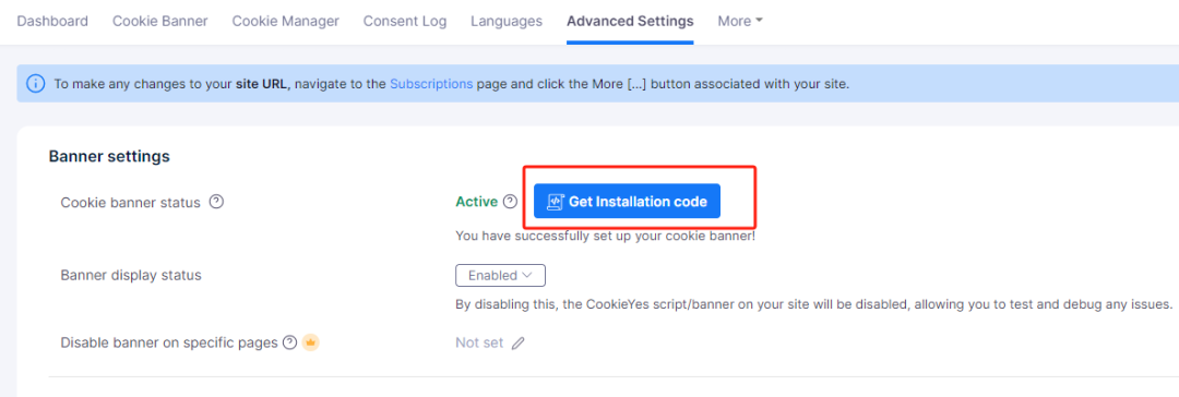 1.登录cookieyes的后台进入个人中心,找到Advancd settings,点击之后找到以一个banner settings,这里会有一个蓝色的按钮,点击获取代码