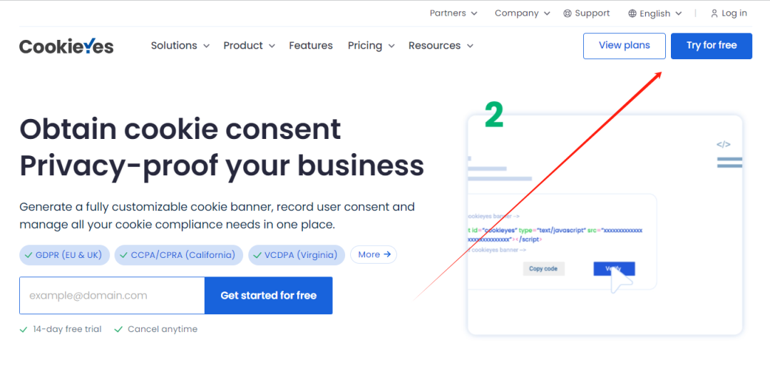 https://www.cookieyes.com/,登录之后点击Try free注册一个Cookie Yes的账号