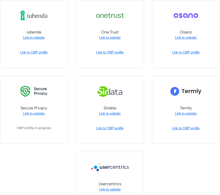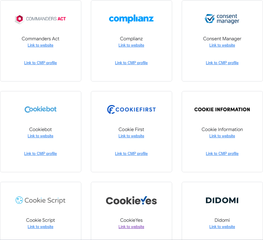 安装consent mode前,我们要找到google认证的CMP合伙作伴,只有这些机构是跟谷歌合作的可以去使用,我把这些机构都列到下面了: