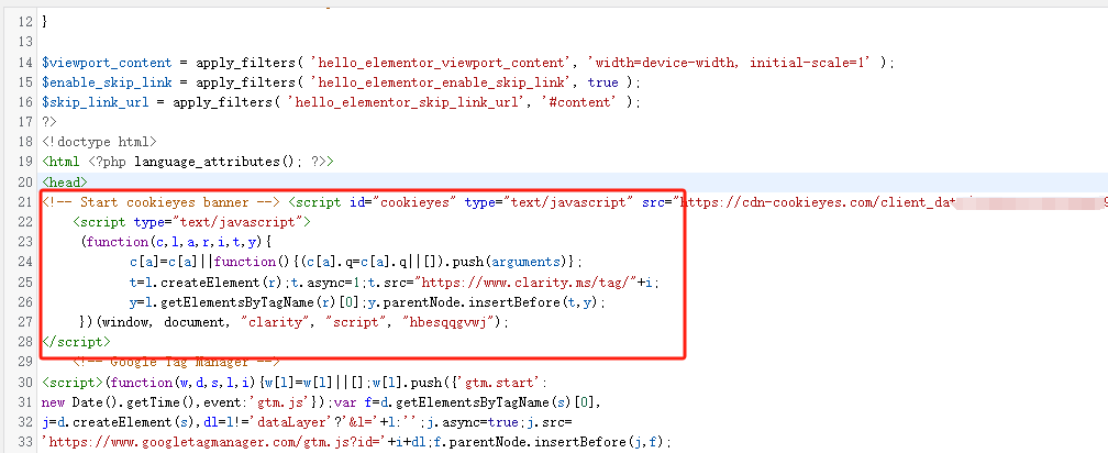 安装完成之后,在代码模板里面就已经出现了我们刚才安装的Cookie Yes的代码了,接下来我们需要进行进一步的配置代码。