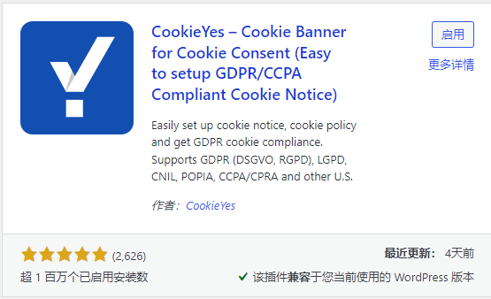 直接在插件市场搜索Cookie Yes插件安装启用,但是Russell不喜欢用插件实现,对于WP网站插件越少越好,插件多了不但会影响网站的速度,而且还会造成插件之间的冲突,从而导致网站出现BUG。如果新手不想麻烦的话可以直接用这种方法。