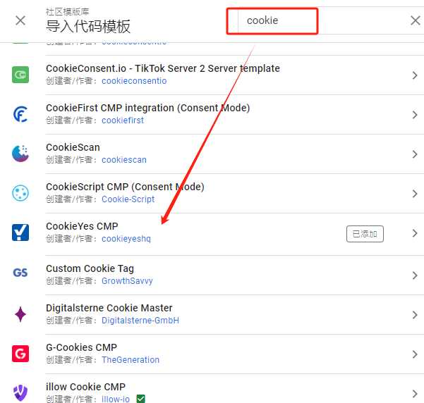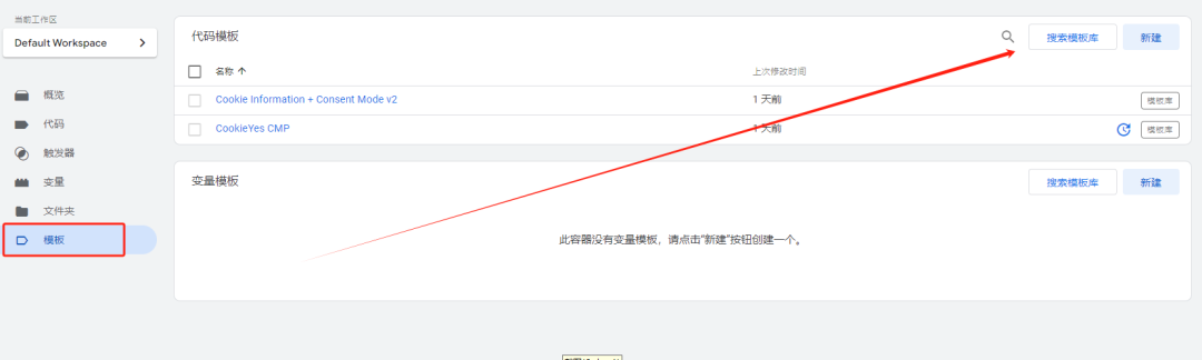 勾选完成后在左侧边栏找到模板,点击搜索模板库,搜索cookie找到Cookie Yes安装。