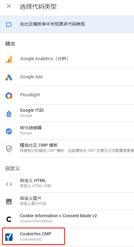 点击左侧边栏中的代码,代码类型选择Cookie Yes CMP,选择之后需要我们输入网站的密钥。