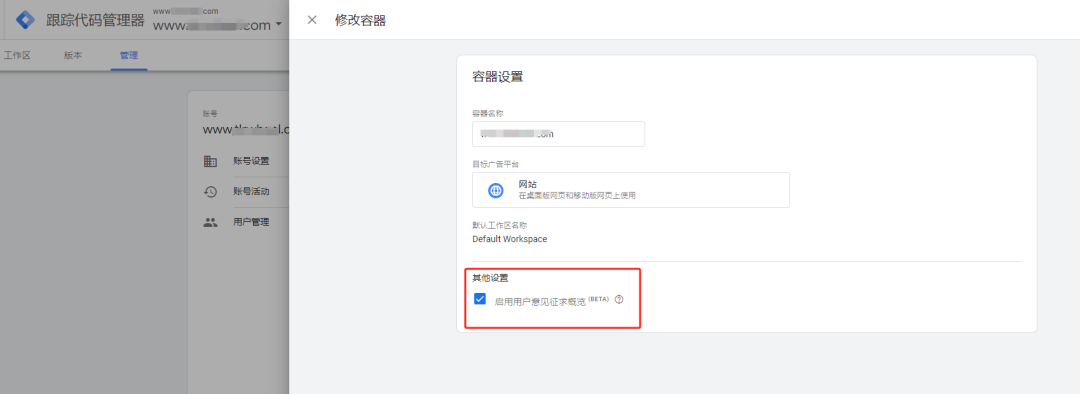 在GTM后台,我们首先需要勾选一个必选项,进入GTM后台找到管理下面的容器设置,将其他设置里面的启用用户建议概览进行勾选。